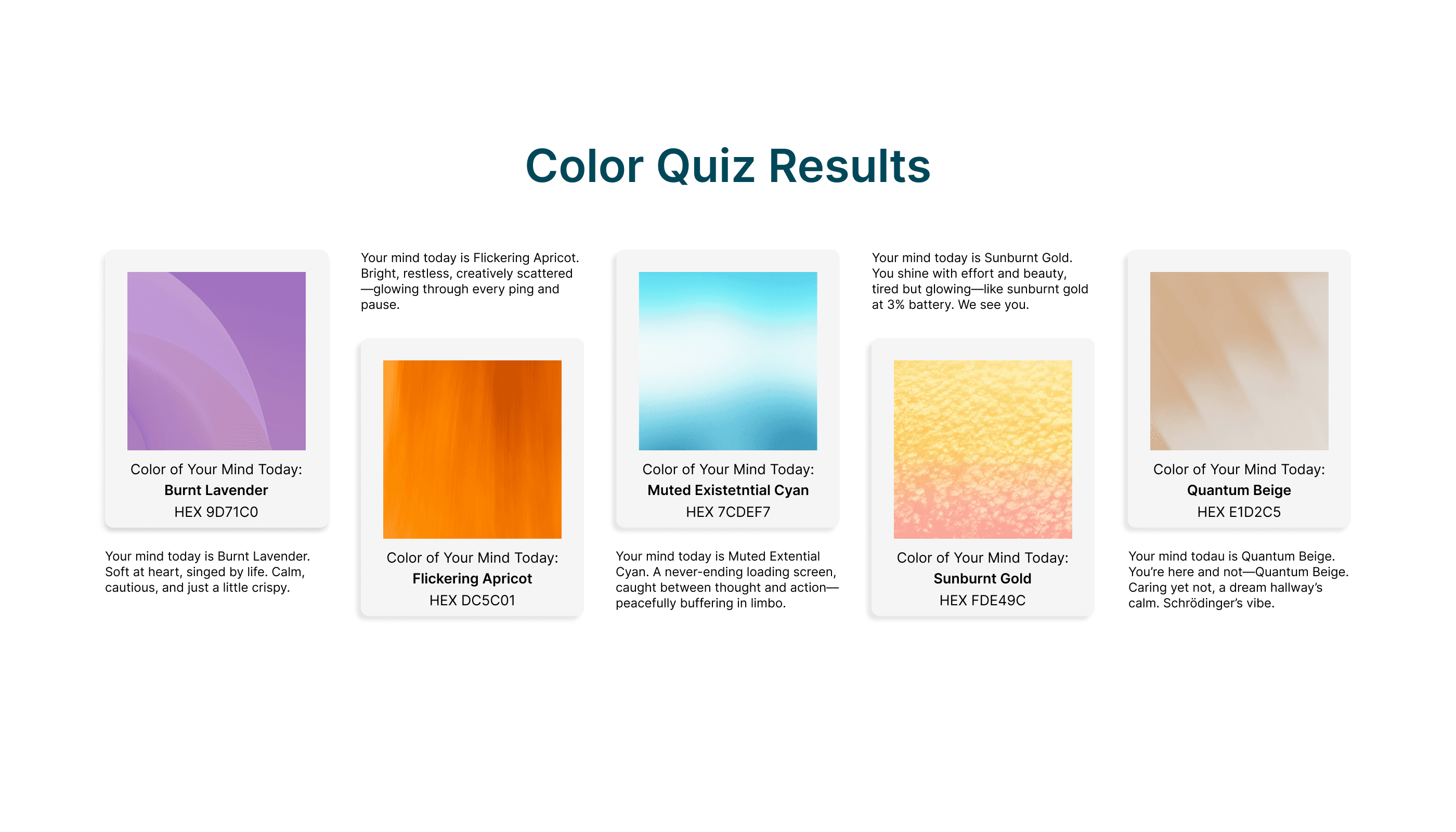 Color Quiz turns voice interaction into a creative moment of self-reflection. Through five surreal questions, users uncover the color that best captures their current mindset—like Burnt Lavender or Quantum Beige. Blending emotional design with voice UX, it offers a thoughtful pause in a typically task-driven space.